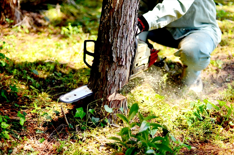 指定された区画のみを指示通りに、チェンソーを用いて伐採作業を行っていきます。